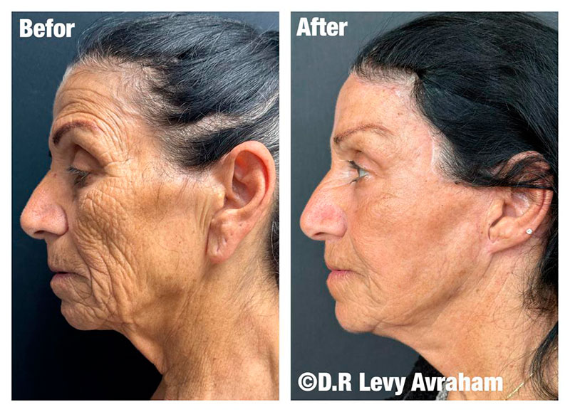 מתיחת פנים מולטי-לייר – בשיטה זו הפנים מטופלות בשכבות שונות ולכן התוצאה משמעותית ונכונה יותר. בתמונה- כ-3 חודשים לאחר מתיחת פנים מולטי לייר. עם הרמת גבות, הרמת שפה, עפעף עליון ותחתון, פילינג פנול, מתיחת פנים וצוואר והזרקת שומן. הפצינטית נראית כאילו איבדה 10-20 שנה מגילה.
